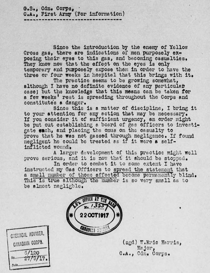 Memorandum by the Chemical Advisor to the Canadian Corps, 27 September 1917, expressing concern that men were deliberately contaminating themselves with mustard gas. (Library and Archives Canada http://data2.collectionscanada.ca/e/e062/e001540690.jpg)