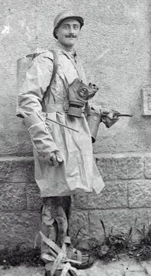 Member of a French mustard gas decontamination squad, with oil impregnated overalls, ARS respirator and Vermorel sprayer containing chlorine of lime. © Simon Jones