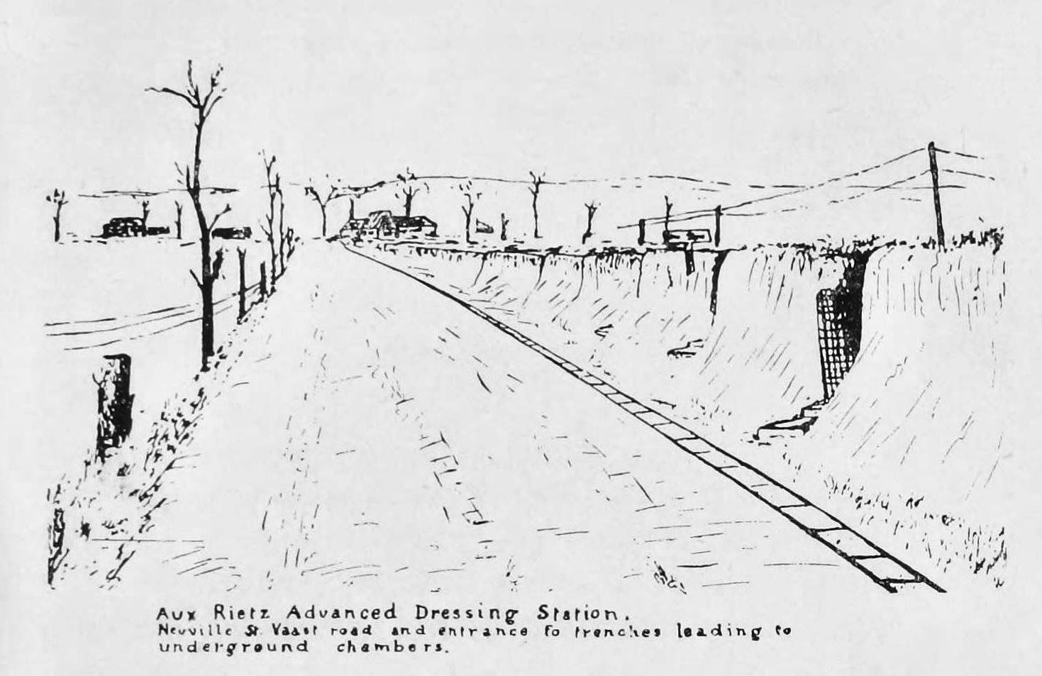 The Advanced Dressing Station, near a dangerous crossroads known as Aux Rietz, was just over a mile from the front line and had to be located underground to protect against shellfire.