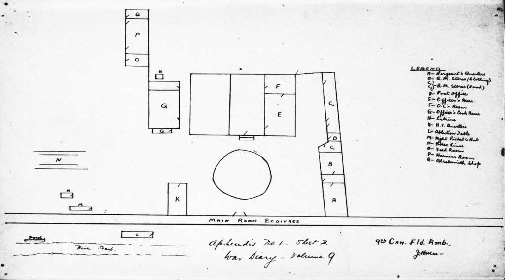 Plan of the headquarters buildings in Ecoivres, as taken over by 9th Canadian Field Ambulance in October 1916. [8]