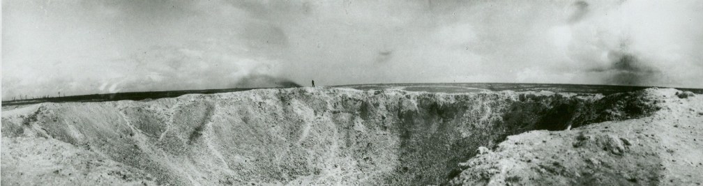 … the earth heaved and flashed, a tremendous and magnificent column rose up into the sky. There was an ear-splitting roar, drowning all the guns, flinging the machine sideways in the repercussing air. The earthy column rose, higher and higher to almost four thousand feet. There it hung, or seemed to hang, for a moment in the air, like the silhouette of some great cypress tree, then fell away in a widening cone of dust and debris. A moment later came the second mine. Again the roar, the upflung machine, the strange gaunt silhouette invading the sky. Then the dust cleared and we saw the two white eyes of the craters.[35]